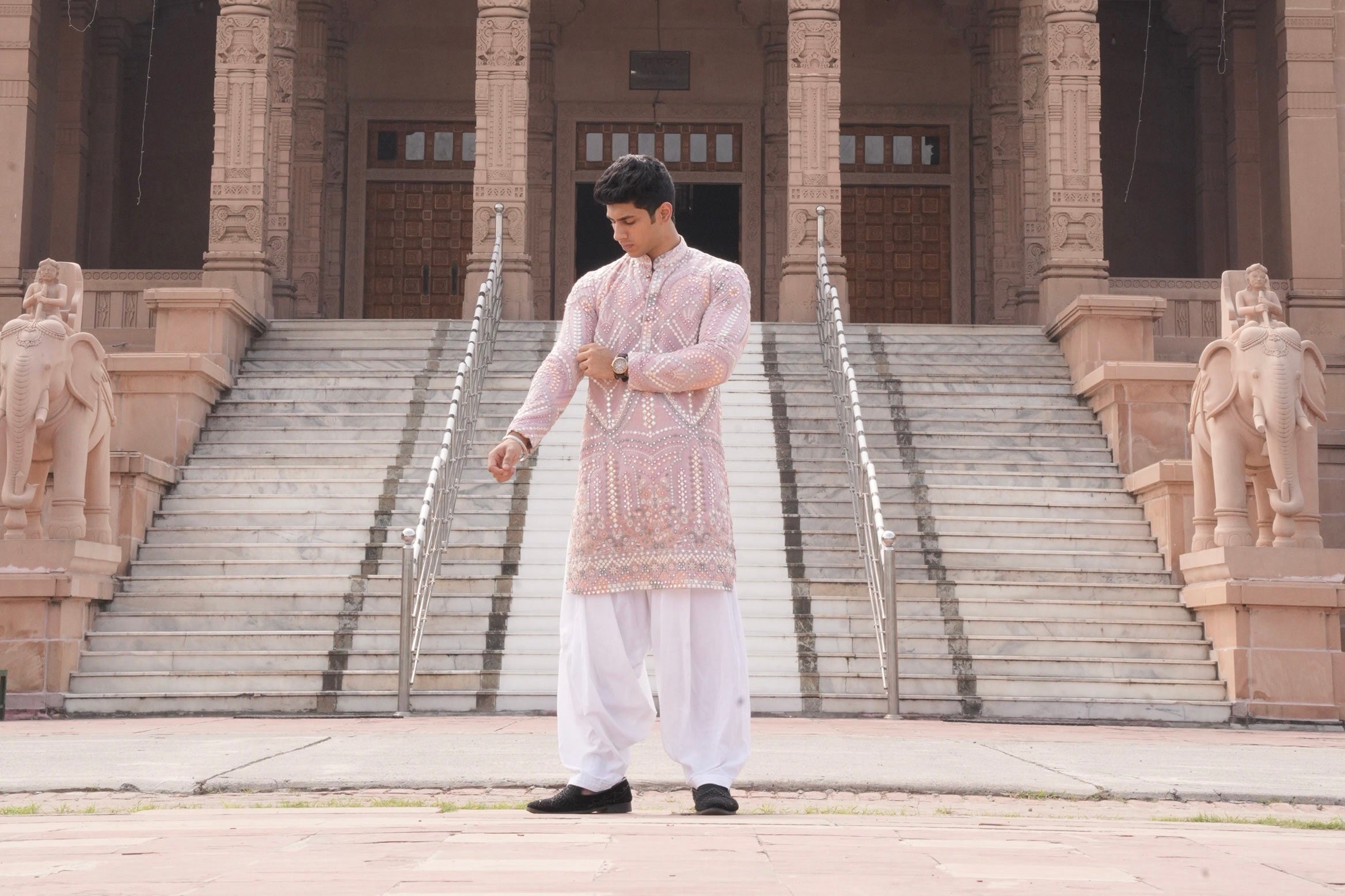 Gulzar Pink Mirrorwork Kurta for Men | Festive & Wedding Wear by Roohdari